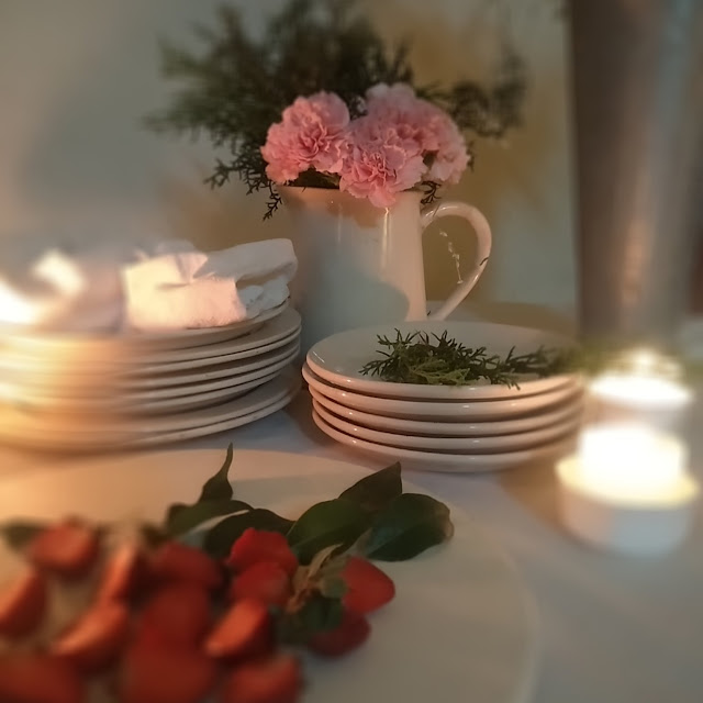 Month Feb is already here. Everybody knows what's on the way. V-day is special day to the family and i am sure the home is going to get filled with fresh flowers, lots of chocolates, wine, cards, candles and gifts. Setting a pretty table is everyone's option and it could be for a big or small crowd or candle light dinner just for two. A table is all about presentation. Created a buffet table to get inspired for the V-day with eye catching Strawberries, gorgeous florals and candles.